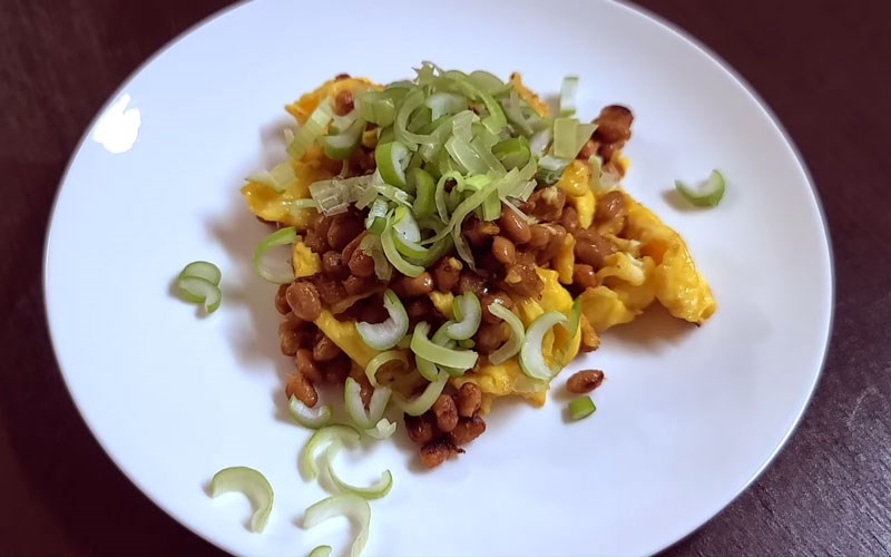 Cho phần trứng khuấy cùng đậu natto ra đĩa. Lúc này, bạn có thể cắt thêm một vài lát hành ba roa để rải lên bề mặt để tăng thêm hương vị cũng như làm món ăn đẹp mắt hơn.