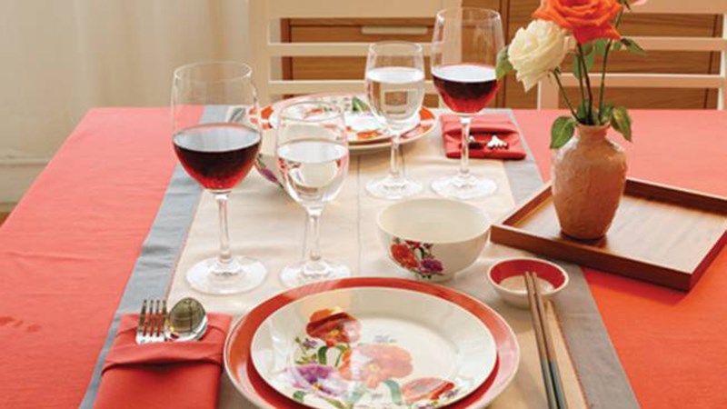Theo văn hóa phương đông màu đỏ là màu tượng trưng cho sự may mắn cát tường vì thế dùng khăn trải bàn màu đỏ kết hợp với bộ chén dĩa có màu trắng in hình hoạ tiết đơn giản là ấn tượng nhất!