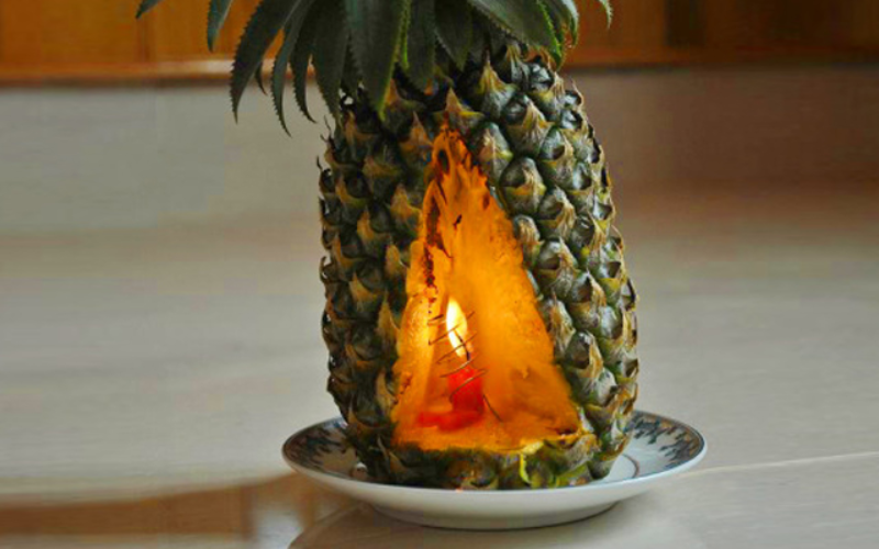 Đầu tiên, bạn cần chọn một trái thơm chín, rửa sạch, dùng dao để khoét một lỗ trên trái thơm, có hình dạng phù hợp với nến sáp bạn muốn dùng. Sau đó, bạn đặt nến sáp vào lỗ đã khoét, chú ý để nến không bị lệch hay chạm vào vỏ trái thơm.