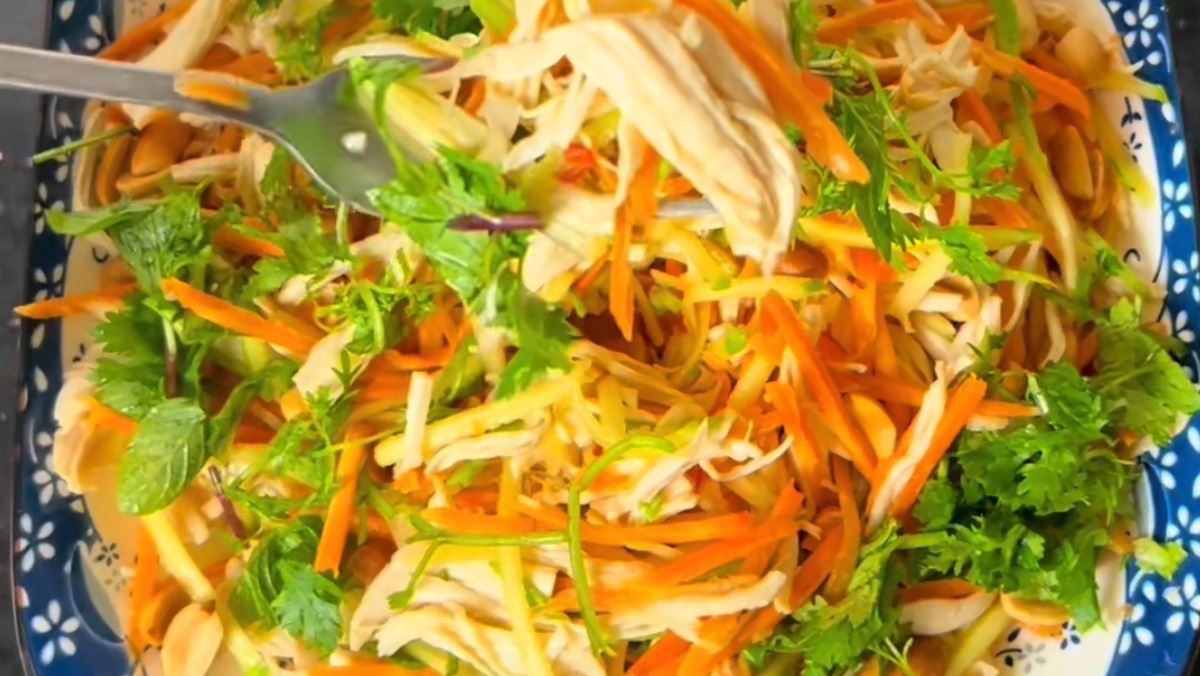 Món nộm ức gà sau khi hoàn thành có màu sắc bắt mắt từ cà rốt và xoài xanh. Khi ăn, bạn sẽ cảm nhận được vị chua ngọt dịu nhẹ thấm trong từng thớ thịt gà dai mềm, hòa quyện cùng vị bùi của lạc rang và mùi thơm nồng của các loại rau thảo mộc.