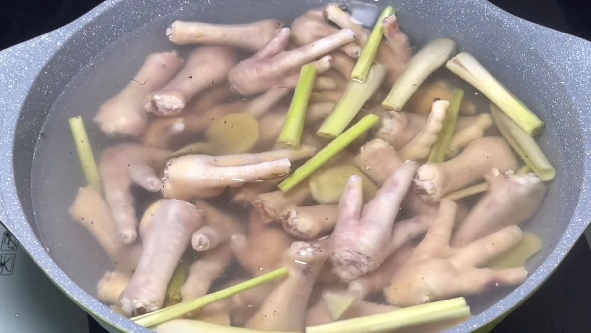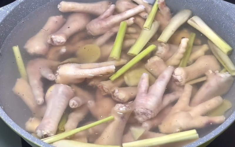 Bạn cho chân gà vào nồi, đổ nước lọc sao cho ngập mặt gà rồi thêm phần sả, gừng đã chuẩn bị, 1/2 muỗng cà phê muối, 1 muỗng cà phê bột ngọt và 1 muỗng cà phê bột nghệ (nếu muốn chân gà có màu vàng bắt mắt).
