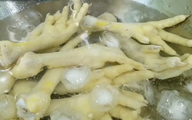 Sau khi luộc đủ thời gian, bạn tắt bếp và để chân gà ngâm trong nồi thêm khoảng 5 phút nữa cho chín đều từ bên trong xương. Tiếp đó, bạn vớt ngay chân gà ra một bát nước đá lạnh lớn để ngâm trong 10 phút.