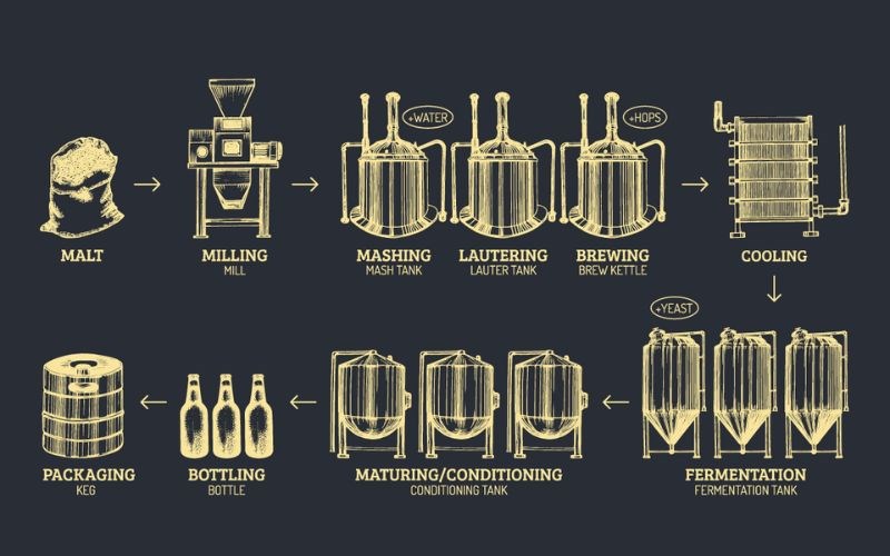 Quy trình sản xuất bia thủ công bắt đầu từ việc nghiền mạch nha và ngâm trong nước nóng để chiết xuất đường. Sau đó, hỗn hợp được đun sôi cùng với hoa bia để tạo độ đắng và hương thơm, rồi làm lạnh nhanh chóng trước khi bước vào giai đoạn quan trọng nhất.