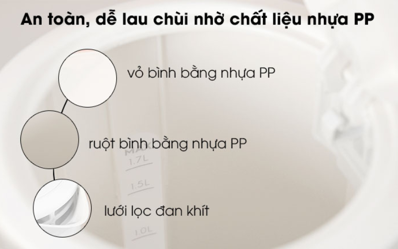- Chất liệu nhựa được sử dụng để sản xuất bình đun phải là loại nhựa chịu nhiệt cao nên thường là nhựa PP nguyên sinh. Đặc biệt, loại nhựa này còn có đặc tính là chịu va đập tốt, dễ lau chùi, chống bám bẩn và không chứa BPA độc hại nên khá an toàn cho sức khỏe người dùng khi làm bình nấu nước.