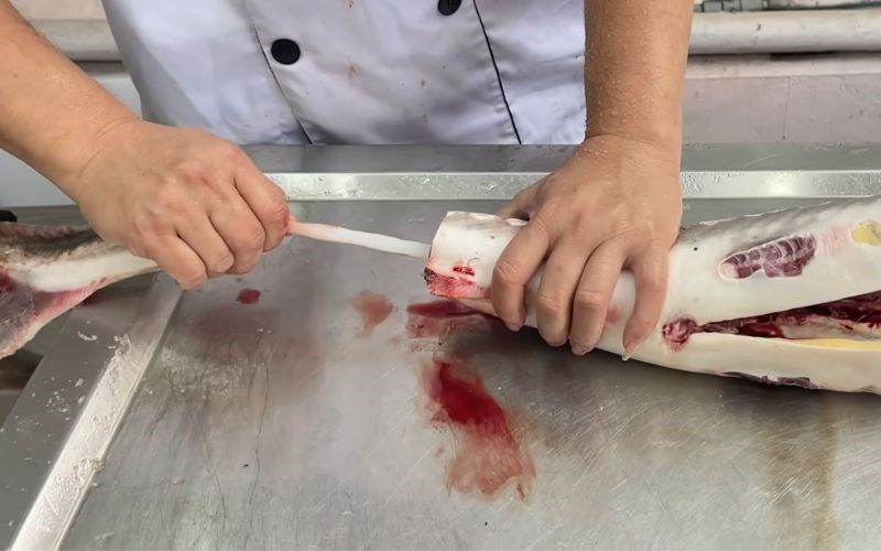 Sơ chế cá tầm đúng cách là bí quyết để khử sạch mùi tanh và giữ trọn độ dai ngọt của thịt cá. Đầu tiên, bạn nên dội nước ấm khoảng 70-80 độ C lên mình cá rồi dùng dao cạo sạch lớp nhớt trắng bám trên da. Sau đó, hãy dùng kéo hoặc dao sắc để lọc bỏ các hàng sụn cứng chạy dọc sống lưng và hai bên hông cá để khi ăn không bị cứng.