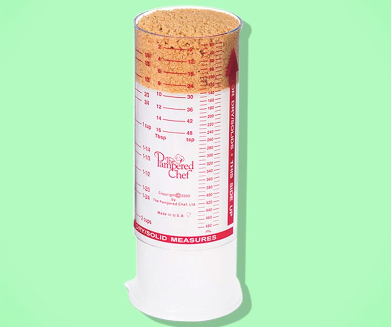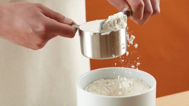 Cho nguyên liệu cần đong vào đầy dụng cụ đo (muỗng, cốc), dùng tay ấn nhẹ. Sau đó, dùng dao gạt ngang miệng muỗng/ cốc để loại bỏ phần nguyên liệu dư.