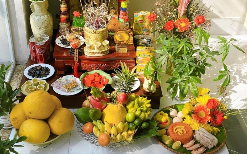 - Mâm quả: Chuẩn bị mâm ngũ quả gồm 5 loại trái cây khác nhau tượng trưng cho ngũ hành (Kim – Mộc – Thủy – Hỏa – Thổ). Các quả thường được chọn là: cam, xoài, thanh long, táo, dưa hấu... quả phải tròn trịa, màu sắc tươi tắn.