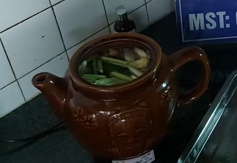 Đặt siêu điện đã chứa hỗn hợp sả, gừng, chanh và nước vào giữa nhà vệ sinh. Ghim điện và để siêu phun khoáng trong khoảng 15 – 30 phút.