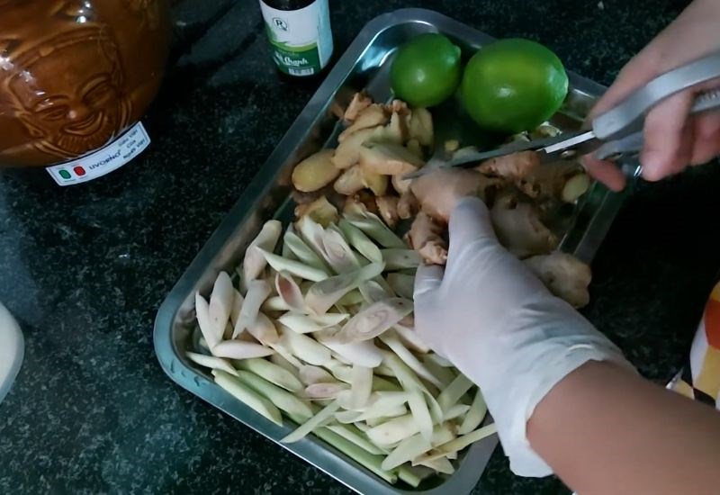 Với sả, bạn có thể cắt thành từng khúc ngắn rồi dùng dao đập dập phần đầu để tinh dầu dễ thoát ra. Hoặc nhanh hơn, dùng kéo cắt nhỏ sả thành từng lát mỏng.