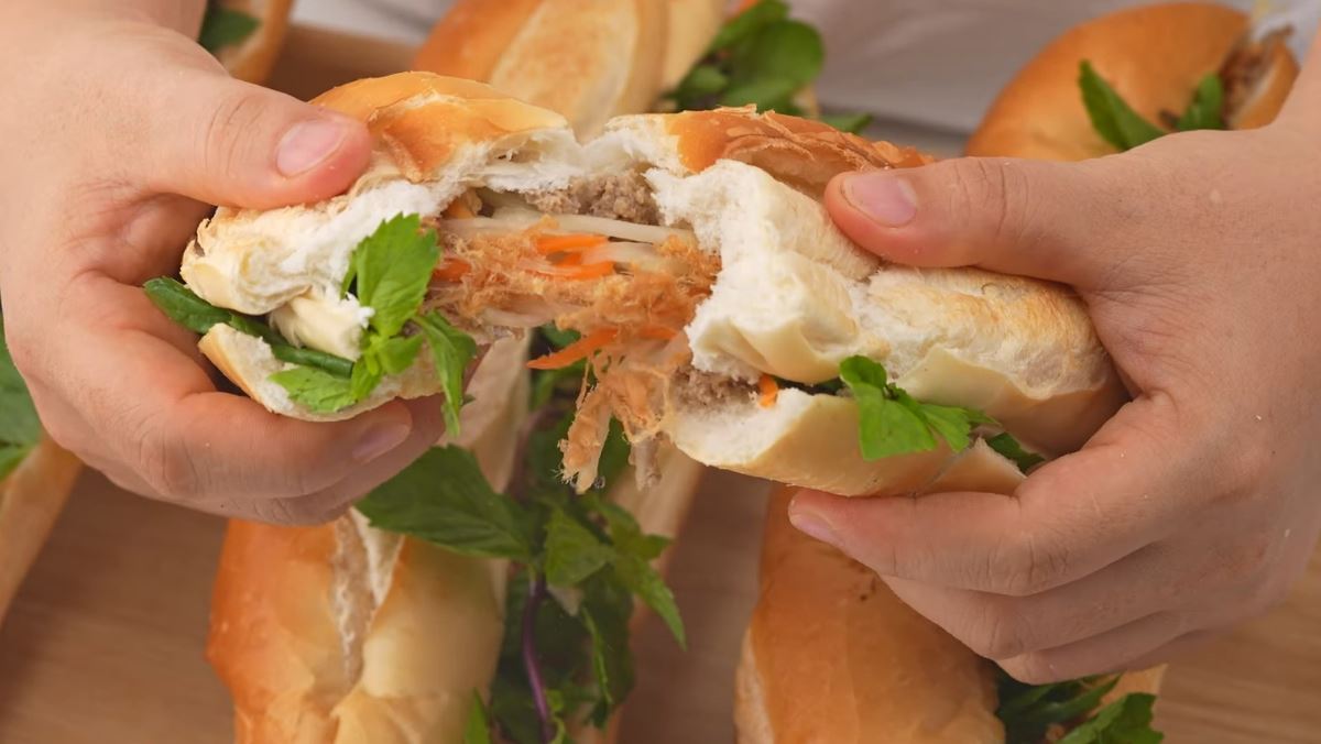 Bạn dùng kéo hoặc dao xẻ dọc ổ bánh mì, phết một lớp pate dày vào bên trong. Thêm nộm đồ chua, chà bông, rau thơm và một ít tương ớt.