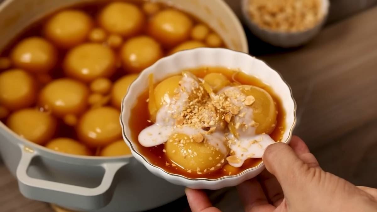 Bạn nấu bánh trong nước đường ở lửa vừa khoảng 15 phút để bánh chín đều, thấm vị ngọt và đạt độ dẻo mịn hoàn hảo.