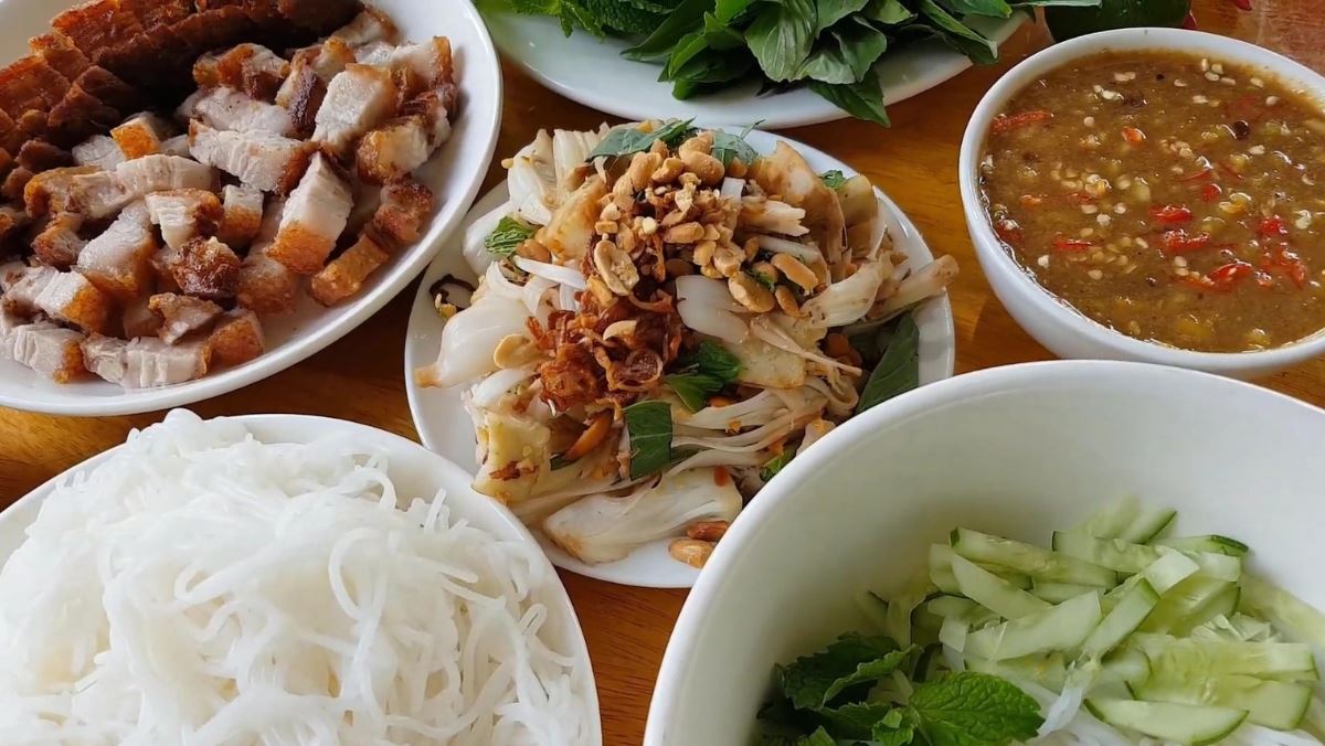 Bạn cho bún tươi vào tô, thêm dưa leo, rau thơm, mít non trộn, thịt heo quay giòn rụm, hành phi và đậu phộng rang lên trên. Cuối cùng, bạn rưới nước mắm nêm thơm lừng, đậm đà vào và trộn đều là có thể thưởng thức ngay món bún heo quay mắm nêm hấp dẫn.