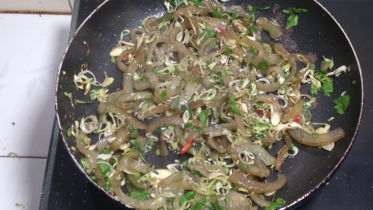 Cuối cùng, bạn cho một ít lá lốt (hoặc rau thơm) đã cắt nhỏ vào chảo. Bạn đảo sơ thêm khoảng 30 giây cho rau vừa chín tới thì tắt bếp. Bạn múc món ăn ra đĩa và thưởng thức ngay khi còn nóng để cảm nhận rõ độ giòn và thơm.