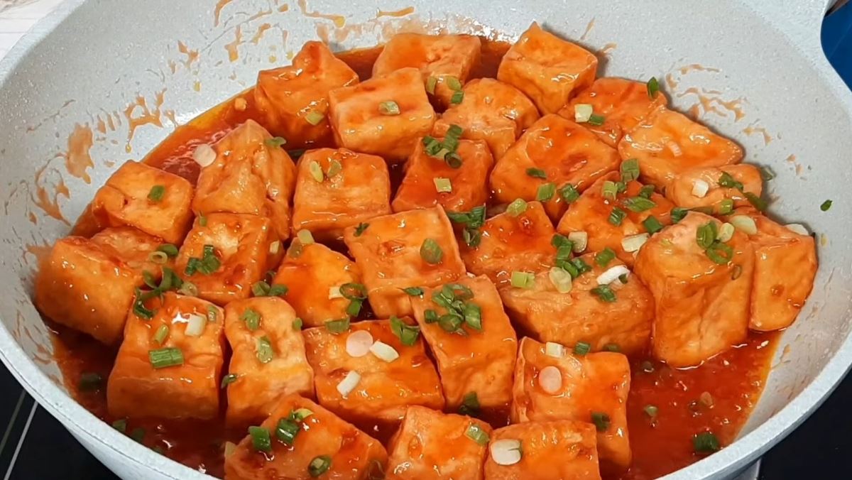 Món đậu hũ sốt chua ngọt sau khi hoàn thành có màu đỏ cam óng ả, bắt mắt và mùi thơm hấp dẫn của tỏi phi.
