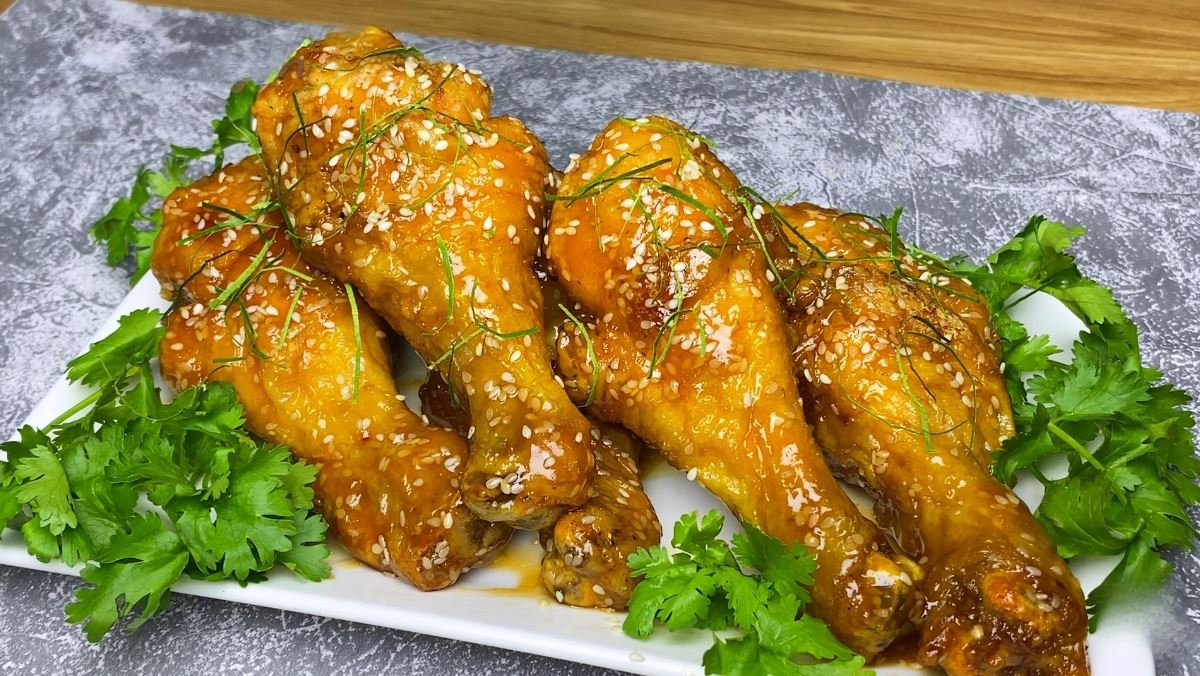 Bạn bày đùi gà ra đĩa, rắc thêm một ít vừng vàng và lá chanh cắt sợi lên trên bề mặt cho thơm. Món đùi gà sốt chua ngọt có lớp vỏ giòn rụm, nước sốt tắc đặc sánh, màu vàng óng ánh cực kỳ bắt mắt.