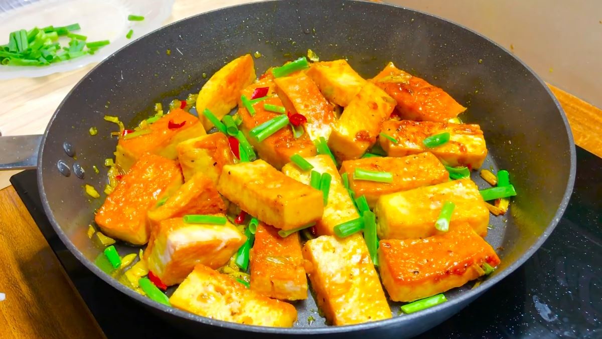 Chiên giò trên lửa vừa và nhỏ, lật đều các mặt cho đến khi miếng giò vàng nhẹ và hơi săn lại.