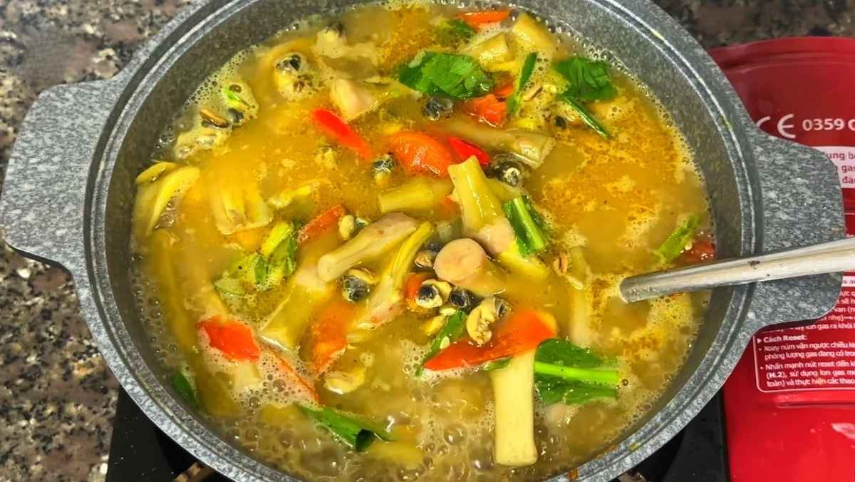 Nêm nếm lại cho vừa ăn theo khẩu vị gia đình rồi cho rau ngổ, mùi tàu (có thể thêm tía tô, lá lốt nếu thích) cắt khúc vào, sau đó tắt bếp.