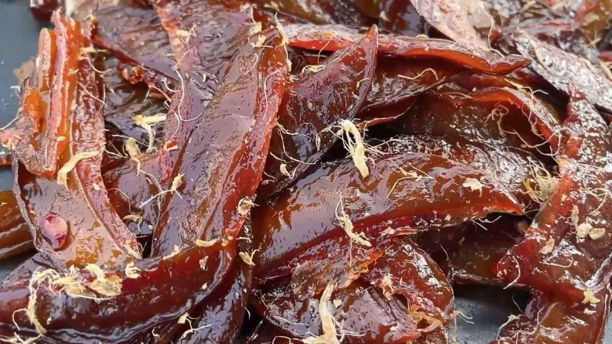 Ô mai khế xào gừng có màu hổ phách cực kỳ đẹp mắt và trong veo. Miếng ô mai dẻo dai, lớp vỏ ngoài hơi giòn nhẹ, hòa quyện giữa vị chua ngọt đặc trưng của khế và vị cay nồng ấm của gừng. Phần bã gừng khô tơi xốp bám bên ngoài càng làm món ăn thêm phần hấp dẫn.