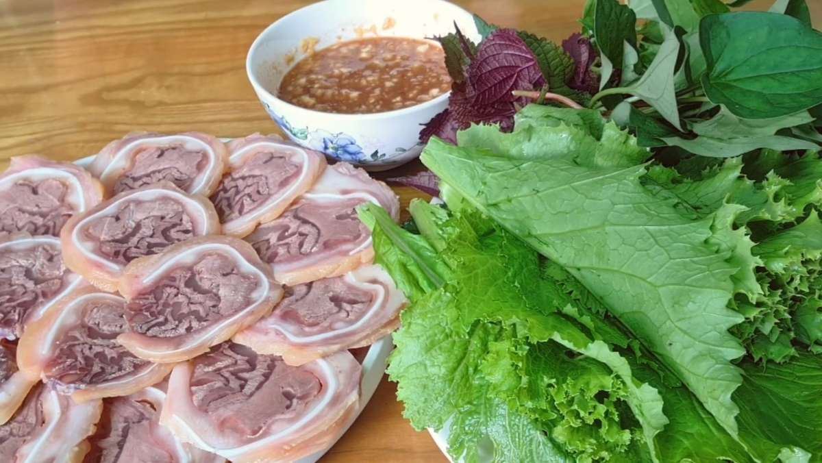 Khi thịt đã ngấm vị, bạn lấy ra cắt bỏ dây và thái thành từng lát mỏng vừa ăn. Miếng thịt thái ra có phần tai heo giòn sụn bao quanh lõi bắp bò đỏ hồng đẹp mắt. Bạn dùng kèm với rau sống, cuộn bánh tráng và chấm mắm nêm để cảm nhận trọn vẹn vị chua ngọt, mặn nồng hấp dẫn.