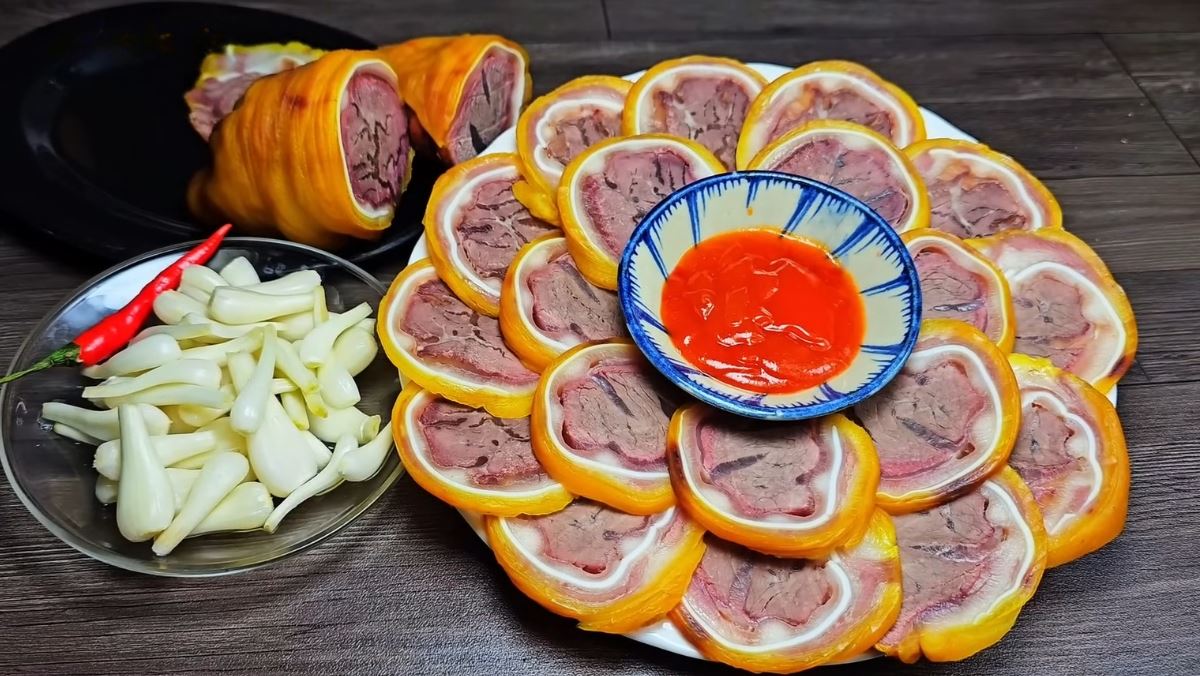 Khi thịt đã săn chắc, bạn tháo dây chỉ, cắt thành những lát mỏng vừa ăn và bày ra đĩa cùng với củ kiệu hoặc tương ớt để thưởng thức.
