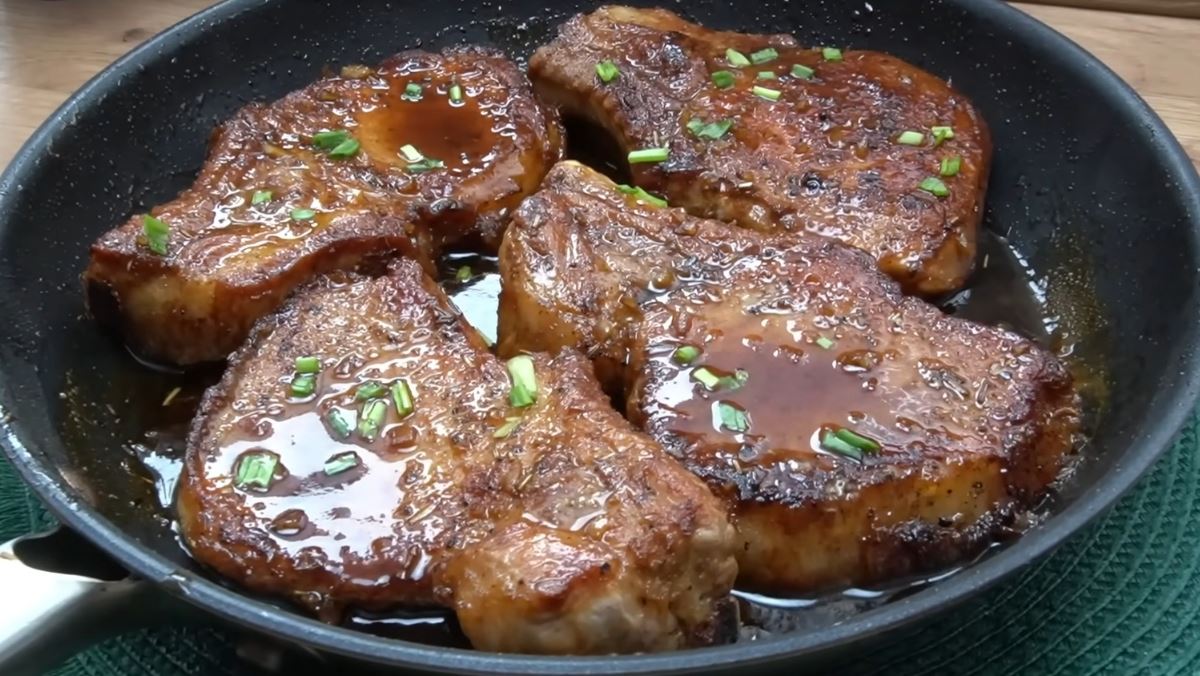Món thịt heo áp chảo hoàn thành có màu vàng nâu cực kỳ bắt mắt và bóng mượt từ sốt mật ong. Miếng thịt bên ngoài cháy xém nhẹ nhưng bên trong vẫn giữ được độ mềm mọng, thấm đẫm vị ngọt thanh của mật ong hòa cùng mùi bơ tỏi thơm lừng.