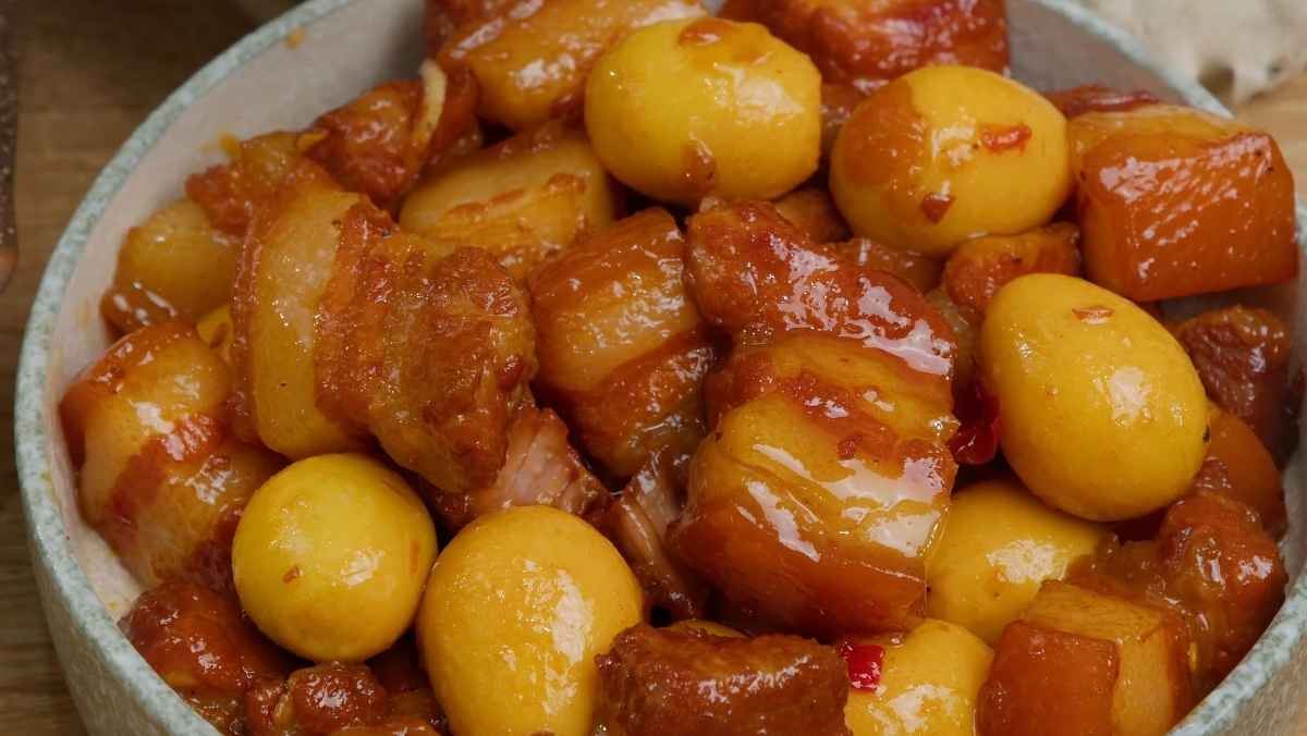 Món thịt kho sau khi hoàn tất có màu nâu cánh gián cực kỳ bắt mắt, nước kho trong trẻo và thơm mùi nước dừa. Miếng thịt ba chỉ mềm tan, phần mỡ trong quánh lại, trứng cút bùi béo thấm đẫm gia vị đậm đà. Món này ăn kèm với cơm nóng và dưa cải muối chua là chuẩn vị nhất.