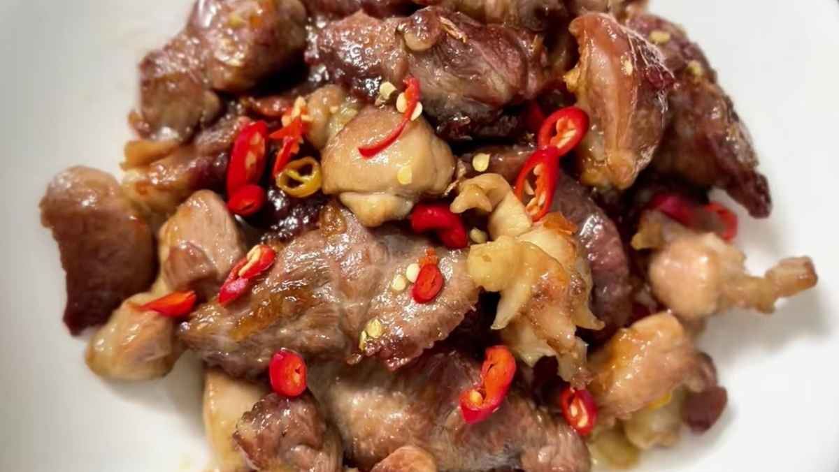 Dùng đũa đảo đều tay ở lửa vừa cho đến khi thịt tiết ra mỡ, săn lại và các cạnh chuyển sang màu cánh gián đẹp mắt, đạt độ giòn nhẹ bên ngoài.