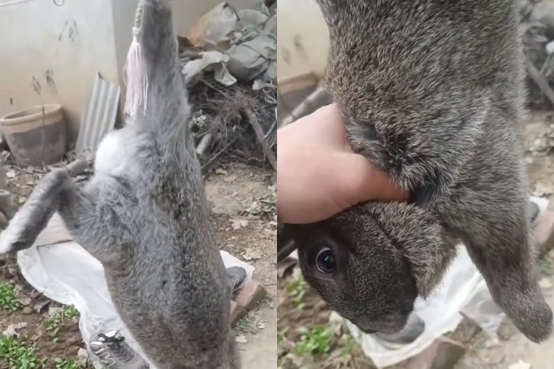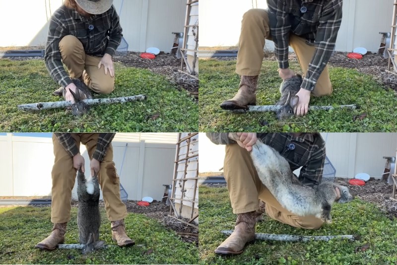 Bạn kẹp phần đầu thỏ nằm bên dưới đoạn cây, sau đó dùng hai chân đứng lên hai đầu cây để giữ cố định. Tiếp theo, bạn nắm chắc hai chân sau của thỏ và kéo mạnh hướng lên trên. Cách này giúp bẻ gãy cổ thỏ nhanh chóng, giúp quá trình làm thịt dễ dàng hơn.