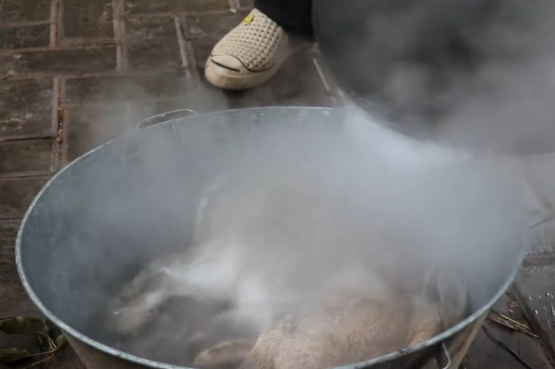Sau đó, bạn nhúng cả con thỏ vào thau nước nóng trong khoảng 30 - 45 giây rồi vớt ra, đặt vào một thau khác. Dùng tay vuốt thử, nếu lông chưa tróc hết thì có thể nhúng lại một lần nữa.