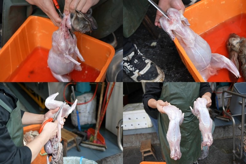 Tiếp đến, bạn nắm hai chân sau của thỏ, nhúng phần đầu vào trước. Khi thấy tai thỏ bắt đầu cong lại thì lập tức nhấc lên, vì tai rất mỏng, nếu để quá lâu sẽ co rút mạnh và khó làm sạch.