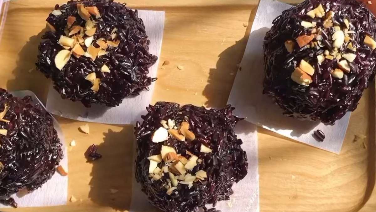 Với phần bột năng màu tím, bạn cũng chia thành 4 phần, cán dẹt ra rồi bọc kín viên nhân vào bên trong. Cuối cùng, bạn lăn viên bột qua lớp gạo lứt đen cho gạo bám đều khắp mặt ngoài.