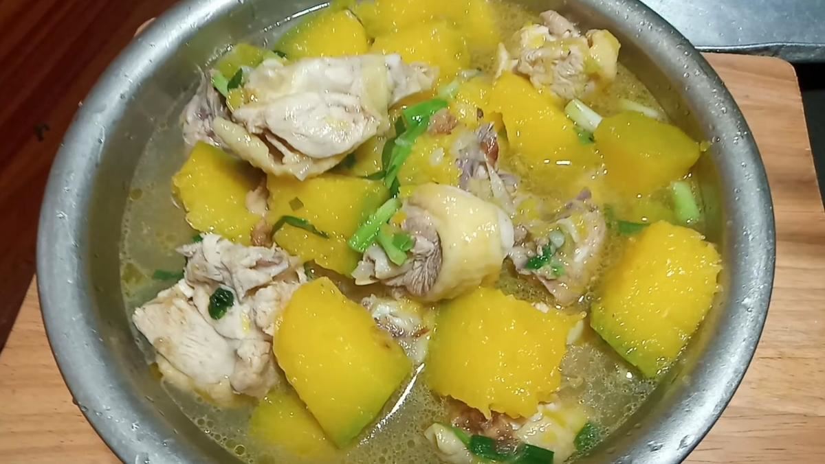 Món canh sau khi hoàn thành có màu vàng bắt mắt từ bí đỏ hòa quyện với màu xanh của hành lá. Nước canh có vị ngọt thanh từ xương gà và vị bùi béo đặc trưng của bí đỏ chín tới. Thịt gà ta dai ngon, thấm đều gia vị, ăn cùng cơm nóng rất tuyệt vời.