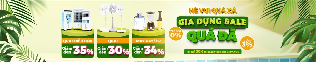 Điện máy XANH hiện đang có chương trình "HÈ VUI QUÁ XÁ, GIA DỤNG SALE QUÁ ĐÃ" với nhiều ưu đãi cực sốc cho các mặt hàng điện gia dụng đa dạng mẫu mã (Áp dụng tùy sản phẩm):