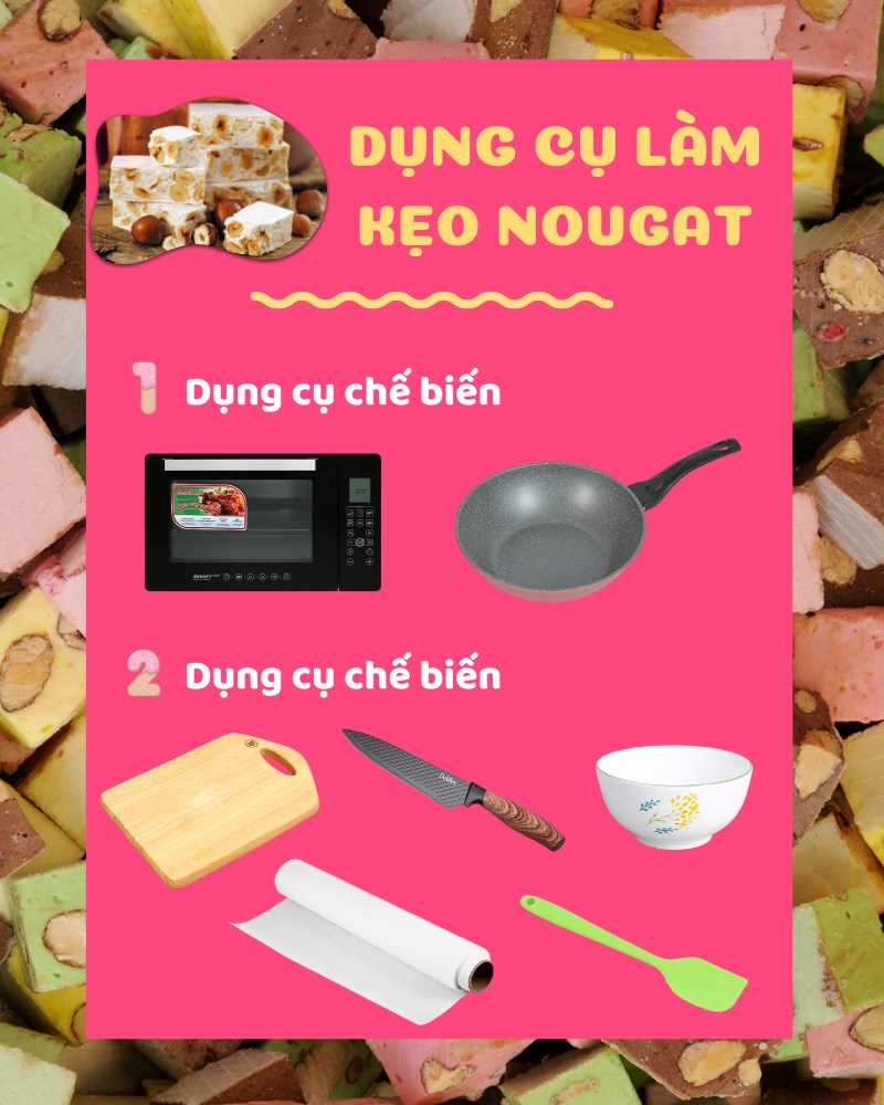 Dụng cụ chính để chế biến món kẹo nougat thơm ngon, đó chính là chảo chống dính. Khi đun các nguyên liệu như kẹo bơ, kẹo marshmallow, bột sữa nguyên kem,... ở nhiệt độ vừa phải vào chảo chống dính thì lúc này thành phẩm sẽ có đột sệt vừa phải, không bị bám dính vào nồi, dễ dàng vệ sinh.