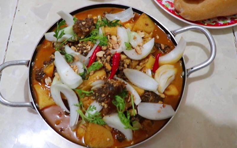 Thịt dúi xào cùng sả, ớt, nước cốt dừa và hành tây mang lại hương vị đậm đà, béo ngậy, rất bắt miệng khi dùng kèm với bánh mì hoặc cơm nóng.