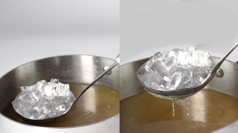 Múc 1 vá nước đá, sau đó đảo đáy vá trên bề mặt nồi nước cho đến khi phần dầu mỡ bám hết vào đáy vá. Cực kì dễ thực hiện đúng không nào.