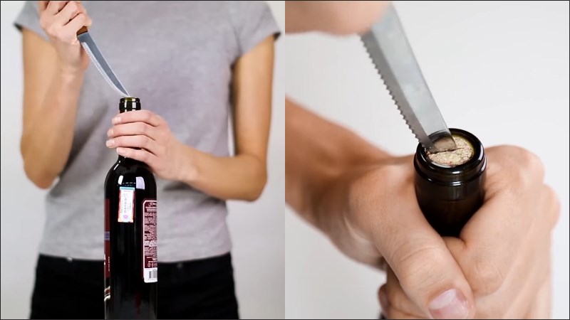 Nếu bạn không có sẵn một dụng cụ khui rượu chuyên dụng, bạn có thể sử dụng dao làm bếp cũng rất hiệu quả và tiện lợi.