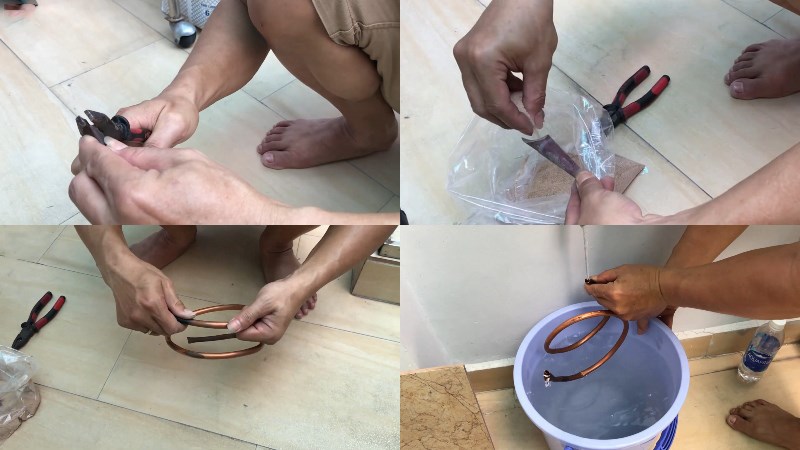 Sau khi đã cho cát rang khô vào đầy ống đồng thì tiếp tục dùng kèm ép dẹp đầu ống còn lại rồi từ từ cuốn cong ống đồng thành hình dạng lò xo. Khi đã hoàn thành thao tác, bạn dùng kèm cắt bỏ phần dẹp ở hai đầu ống đồng rồi đem ống rửa dưới vòi nước cho thật sạch.