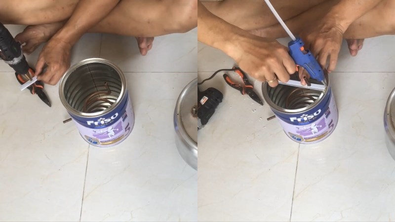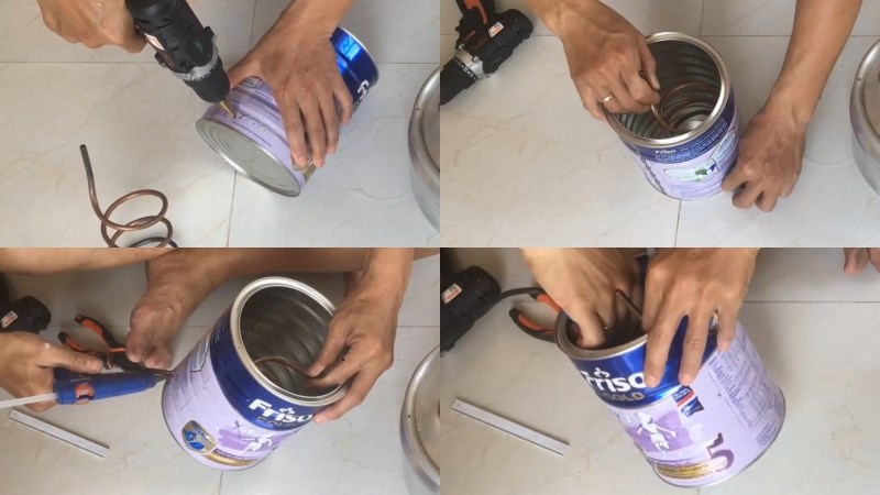 Đối với vỏ lon sữa lớn, bạn lấy máy khoan khoan một lỗ nhỏ phía dưới lon đủ cho đầu tròn của ống đồng đút qua. Sau đó sẽ sử dụng súng bắn keo silicon không mùi cố định thật chặt ống đồng cả trong lẫn ngoài với lỗ vừa khoan trên lon sữa.
