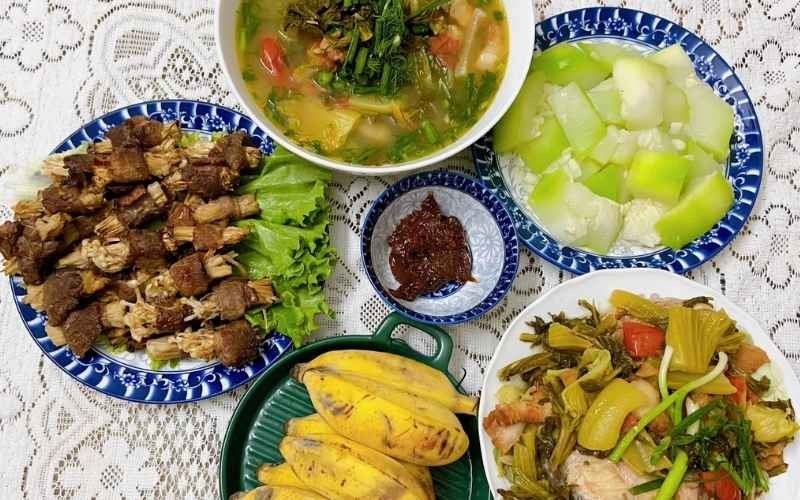Cuối cùng, đĩa rau muống luộc xanh mướt đi kèm bát nước canh dầm sấu chua thanh chính là "vũ khí" giải nhiệt hữu hiệu nhất cho những ngày nắng nóng. Vị chua dịu của sấu trong nước rau không chỉ giúp giải ngấy tức thì cho món thịt ba chỉ rang mà còn tạo cảm giác sảng khoái, thanh tao để kết thúc bữa cơm một cách nhẹ lòng.