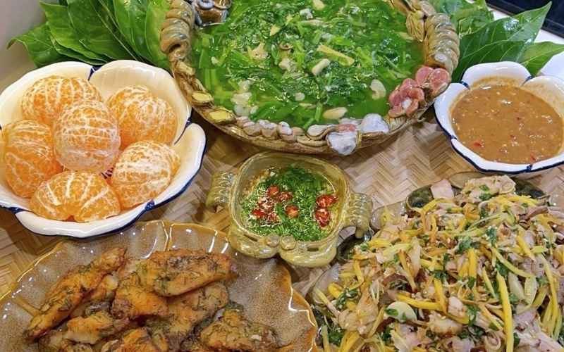 Những miếng thịt bắp được luộc chín tới, thái lát mỏng trắng ngần với phần gân giòn nhẹ và thớ thịt ngọt mọng tự nhiên. Đây là món đạm chủ đạo của mâm cơm, mang lại sự mộc mạc nhưng đủ đầy, tạo nền tảng vững chắc để các món rau củ và đồ rán đi kèm phát huy tối đa hương vị thanh khiết.