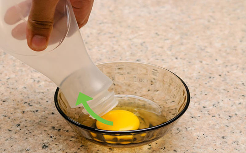 Để tách lòng đỏ và lòng trắng trứng, bạn đập trứng ra bát, để ý không để vỡ lòng đỏ. Tiếp theo, bạn lấy một chai nhựa sạch, bóp nhẹ để thổi không khí ra. Sau đó, bạn đưa miệng chai gần lòng đỏ và nhả tay ra để hít lòng đỏ vào trong chai. Cuối cùng, bạn cho lòng đỏ ra một cái bát khác và tiếp tục với những quả trứng còn lại.