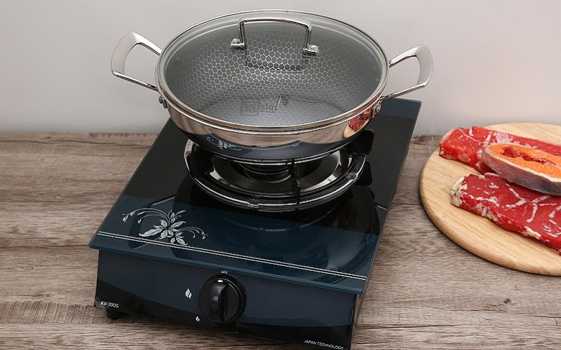 Bên cạnh đó, chảo inox 2 quai có thể chịu mức nhiệt tối đa 300 °C và được trang bị nắp đậy bằng kính trong suốt có viền bo inox giúp tiện quan sát thức ăn trong quá trình nấu và hạn chế văng bắn dầu mỡ, đảm bảo vệ sinh xung quanh bếp.