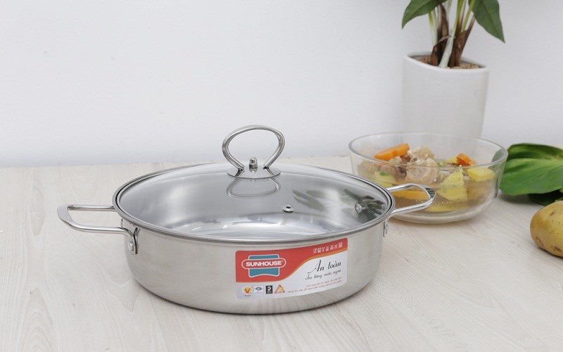 | Nồi lẩu inox nắp kính 24 cm Sunhouse SHL24 | Bếp gas, dùng được bếp từ, bếp hồng ngoại | Inox 430 | Nắp kính | 24 x 7.5 x 35 cm |