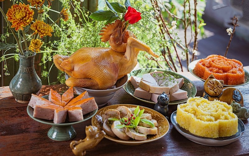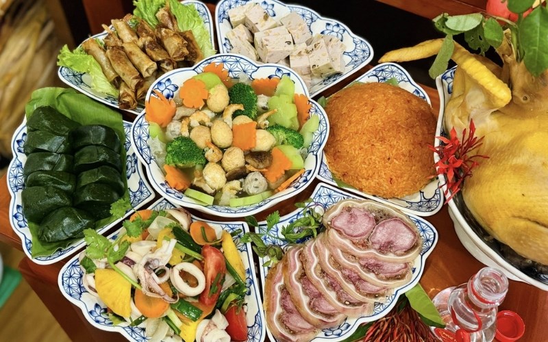 Tùy theo phong tục từng vùng miền, mâm cỗ mặn dâng gia tiên sẽ có những đặc trưng riêng biệt nhưng đều chung lòng thành kính. Tại miền Bắc, mâm cỗ thường được chuẩn bị nghiêm túc theo quy tắc "4 bát 6 đĩa" để thể hiện sự sung túc. Các món chính bao gồm gà luộc cánh tiên, bánh chưng, xôi gấc, canh măng mọc hoặc canh bóng thả, đi kèm giò lụa, nem rán và rau xào thập cẩm.