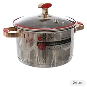 Cuối cùng là nồi inox 5 đáy nắp kính 24 cm Elmich Red Velvet với đường kính nồi lớn hơn, 24 cm có thể luộc nguyên con gà dưới 1kg hoặc phù hợp nấu các món canh, kho cho gia đình đông thành viên. Nồi được làm từ chất liệu inox 304 màu bạc sáng bóng, phần tay cầm và nắp có màu vàng đồng đẹp mắt.