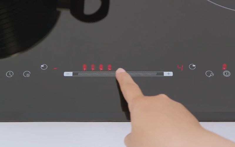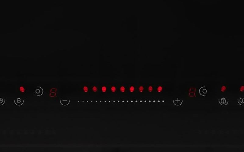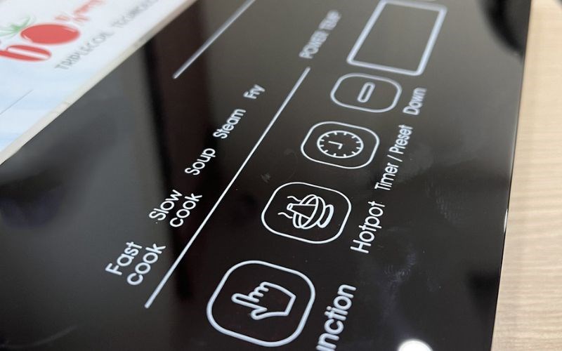 Bảng điều khiển cảm ứng gồm các phím chức năng như tăng/giảm công suất, chế độ nấu, hẹn giờ, bật/tắt bếp,...