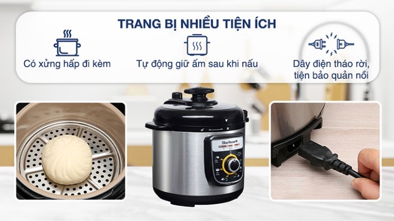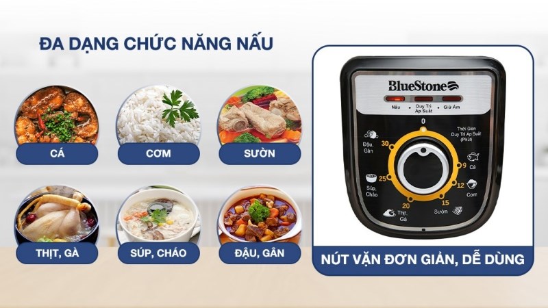 Nồi áp suất Bluestone được trang bị khá nhiều chức năng nấu tiện lợi như hầm, hạt/đậu, hấp, nấu cháo, súp, luộc, làm bánh, sữa chua, gà, bò,...hỗ trợ người dùng hiệu quả khi nấu, hầm thức ăn tiện lợi.
