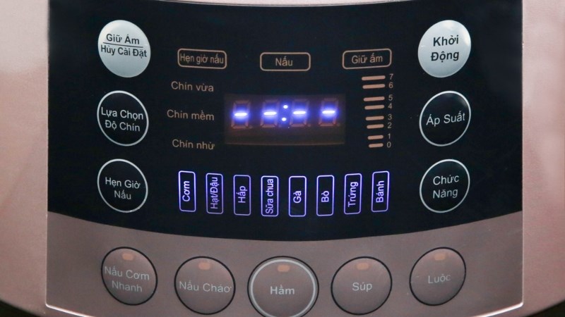 Bước 8: Trong quá trình nấu sau khi áp suất đủ, nồi sẽ được chuyển chế độ áp suất với tiếng bíp. Khi đó màn hình sẽ hiển thị thời gian đếm ngược để giữ áp suất. Chế độ "Giữ ấm" sẽ hiển thị khi thời gian giữ áp suất trở về "0" và tiếng bíp được phát ra lần nữa để thông báo.