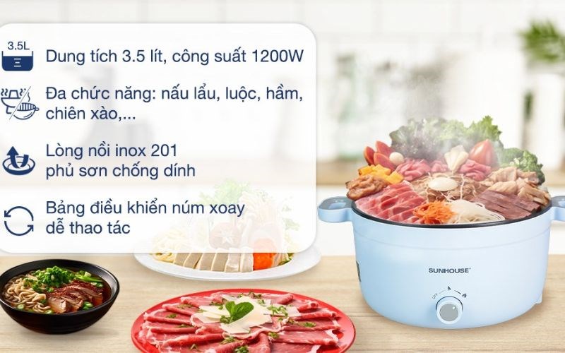 Với công suất 1200W, nồi giúp nấu chín thực phẩm nhanh chóng. Lòng nồi inox chống dính và nắp kính cường lực dễ dàng vệ sinh, tay cầm chống bỏng an toàn.
